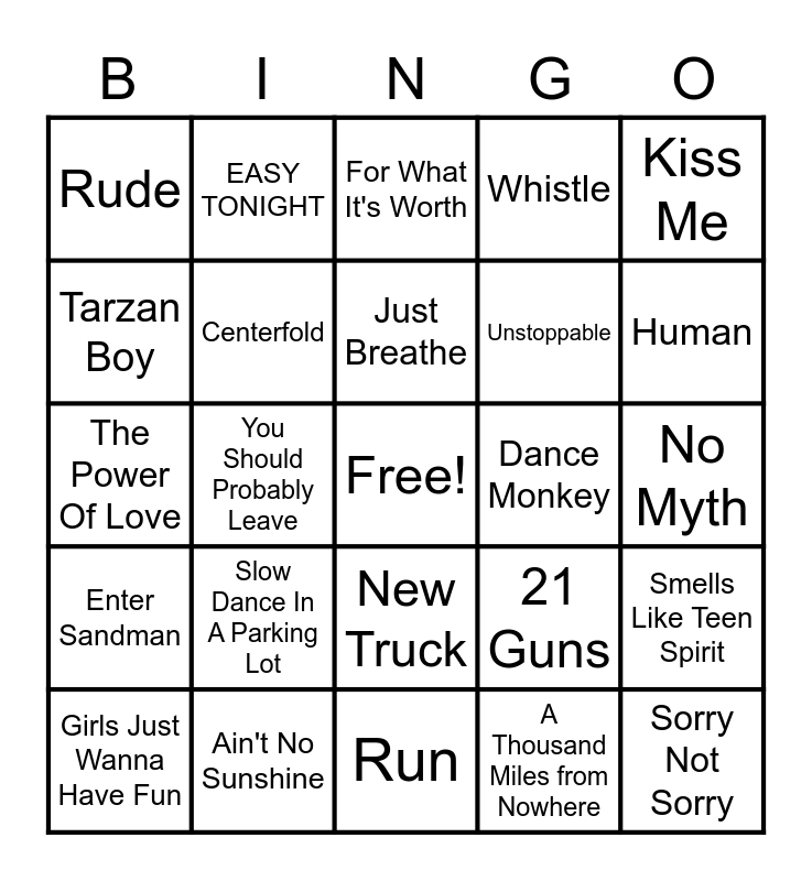 This bingo card has a free space and 50 words: Green Green Grass, Sorry Not Sorry, broken, Run, Slow Dance In A Parking Lot, Bartender, EASY TONIGHT, Bang!, Tarzan Boy, Valerie, Centerfold, Whistle, Smells Like Teen Spirit, 21 Guns, Island In The Sun, Name, Just Breathe, Dance Monkey, My Universe, Kiss Me, You Should Probably Leave, A Thousand Miles from Nowhere, Rude, Unstoppable, Wine, Beer, Whiskey, Betty, Human, Walk Of Life, For What It's Worth, New Truck, Simple, Can't You See, Come Undone, I Like You, Ain't No Sunshine, Beachin', Party Mode, Right On Time, In a Different Light, No Myth, Come Monday, Dreams, Rich Girl, Karma Chameleon, Girls Just Wanna Have Fun, The Power Of Love, 5 Foot 9, Santeria, Enter Sandman and Lil Bit.