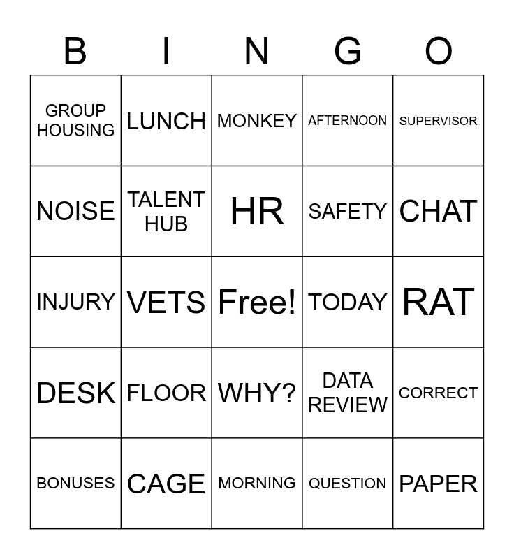 This bingo card has a free space and 24 words: FLOOR, CAGE, HR, BONUSES, SUPERVISOR, GROUP HOUSING, NOISE, LUNCH, TODAY, WHY?, SAFETY, INJURY, DATA REVIEW, CORRECT, TALENT HUB, QUESTION, RAT, MONKEY, CHAT, VETS, PAPER, DESK, AFTERNOON and MORNING.