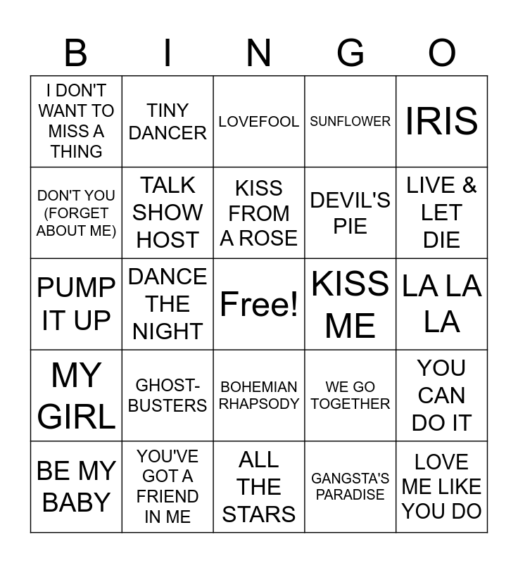 This bingo card has a free space and 34 words: DANGER ZONE, GANGSTA'S PARADISE, KIDS IN AMERICA, LOSE YOURSELF, MY GIRL, TALK SHOW HOST, IRIS, BE MY BABY, TINY DANCER, TAKE MY BREATH AWAY, KISS FROM A ROSE, LOVEFOOL, MEN IN BLACK, 9 TO 5, KISS ME, LIVE & LET DIE, YOU'VE GOT A FRIEND IN ME, PUMP IT UP, GHOST- BUSTERS, WE GO TOGETHER, BOHEMIAN RHAPSODY, LADY MARMALADE, I DON'T WANT TO MISS A THING, LA LA LA, ALL THE STARS, LOVE ME LIKE YOU DO, SUNFLOWER, EYE OF THE TIGER, DEVIL'S PIE, DON'T YOU (FORGET ABOUT ME), GOLDEN, DANCE THE NIGHT, YOU CAN DO IT and I HAVE NOTHING.