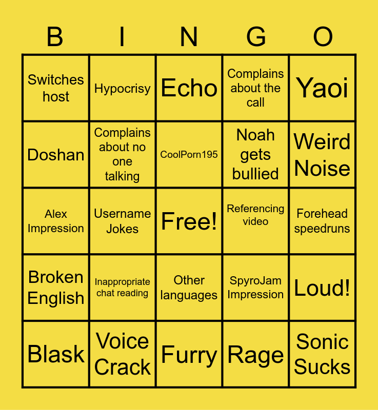 This bingo card has a free space and 24 words: Inappropriate chat reading, Voice Crack, CoolPorn195, Blask, Yaoi, Switches host, Doshan, Hypocrisy, Referencing video, Other languages, Noah gets bullied, Alex Impression, SpyroJam Impression, Loud!, Complains about no one talking, Rage, Forehead speedruns, Echo, Weird Noise, Username Jokes, Sonic Sucks, Broken English, Complains about the call and Furry.