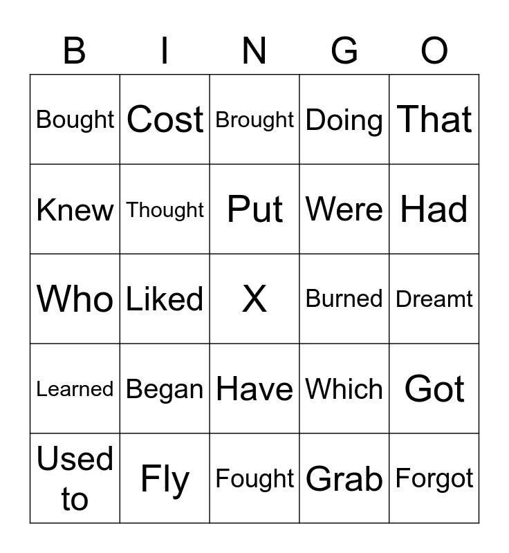 This bingo card has a free space and 29 words: Used to, Use to, Liked, Like, Bought, Brought, Thought, Began, Burned, Fly, Dreamt, Forgot, Fought, Grab, Had, Paid, Have, Learned, That, Who, Which, Was, Were, Knew, Doing, Cost, Got, Put and Spent.