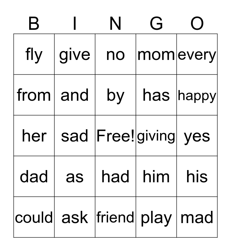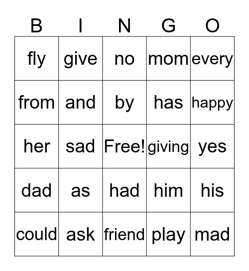 This bingo card has a free space and 24 words: as, ask, by, could, every, fly, from, give, giving, had, has, her, him, his, and, play, yes, no, happy, sad, mad, dad, mom and friend.