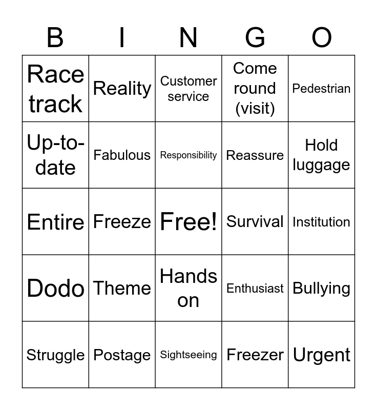 This bingo card has a free space and 52 words: Annual, Urgent, Confirm, Sightseeing, Theme, Gossip, Reality, Fantasy, Up-to-date, Unique, Fabulous, Contain, Bullying, Enthusiast, Enthusiastic, Inspiring, Responsibility, Survival, Ban, Pedestrian, Freeze, Freezer, Race track, Reassure, Career advisor, Sailor, Navy, Spectator, Hold luggage, Cabin crew, Prediction, Come round (visit), Sound effect, Participate, Staffroom, Customer service, Postage, Originally, Essential, Exploration, Finest, Institution, Dodo, Crystal, Hands on, Educational, Virtual reality, Entire, Curiosity, come out, Struggle and Devote.