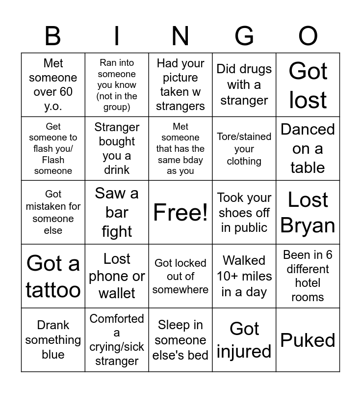 This bingo card has a free space and 48 words: Peed in public, Puked, Passed out (not in your bed), Sleep in someone else's bed, Lost phone or wallet, Cried, Ran into someone you know (not in the group), Went 24 hours with no sleep, Get someone to flash you/ Flash someone, Took a shot before breakfast (6-10 am), Stranger bought you a drink, Did drugs with a stranger, Been in 6 different hotel rooms, Walked 10+ miles in a day, Joined a parade, Crashed a party, Met someone that has the same bday as you, Took your shoes off in public, Got kicked out of somewhere, Got lost, Saw a bar fight, Got injured, Met someone over 60 y.o., Tore/stained your clothing, Went to bed before midnight, Danced on a table, Drank something blue, Tripped and fell, Got locked out of somewhere, Got a tattoo, Got groped, Bought a stranger a drink, Gave your number to a stranger, Adopted a stranger into the group, Comforted a crying/sick stranger, Bought Bryan a drink, Got a stranger to wish Bryan HBD, Lost Bryan, Spilled your whole drink, Ate food off the floor, Phone died, Slept in your day clothes, Had your picture taken w strangers, Gave someone a fake name, Got mistaken for someone else, Lost drugs/got them confiscated, Got something from a parade (not beads) and Got someone's number (not in the group).