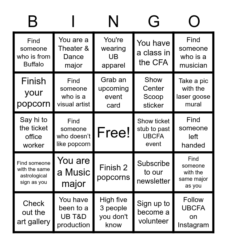 This bingo card has a free space and 32 words: Sign up to become a volunteer, Follow UBCFA on Twitter, Find someone who doesn’t like popcorn, Find someone who is not originally from Buffalo, Find someone with the same astrological sign as you, Find someone who is a visual artist, Find someone who is a musician, Find someone with the same major as you, You are a Theater & Dance major, Introduce yourself to a staff member, Grab an upcoming event card, You're wearing UB apparel, You are an Art major, Show your pop-in sticker, Show ticket stub to past UBCFA event, You are a Media Studies major, Check out the art gallery, Say hi to the ticket office worker, Finish 2 popcorns, You are a Music major, Subscribe to our newsletter, Subscribe to the UBCFA YouTube page, Find someone left handed, You have been to a UB T&D production, Follow UBCFA on Instagram, You have a class in the CFA, Show Center Scoop sticker, Finish your popcorn, Find someone who is from Buffalo, High five 3 people you don't know, Find the UB Print Anywhere station and Take a pic with the laser goose mural.