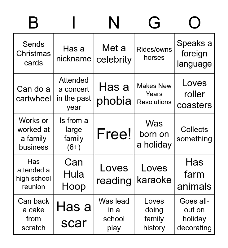 This bingo card has a free space and 24 words: Can Hula Hoop, Has a scar, Has a phobia, Can back a cake from scratch, Speaks a foreign language, Sends Christmas cards, Can do a cartwheel, Has a nickname, Was born on a holiday, Loves reading, Makes New Years Resolutions, Works or worked at a family business, Loves karaoke, Has farm animals, Attended a concert in the past year, Loves doing family history, Collects something, Met a celebrity, Loves roller coasters, Is from a large family (6+), Goes all-out on holiday decorating, Has attended a high school reunion, Rides/owns horses and Was lead in a school play.