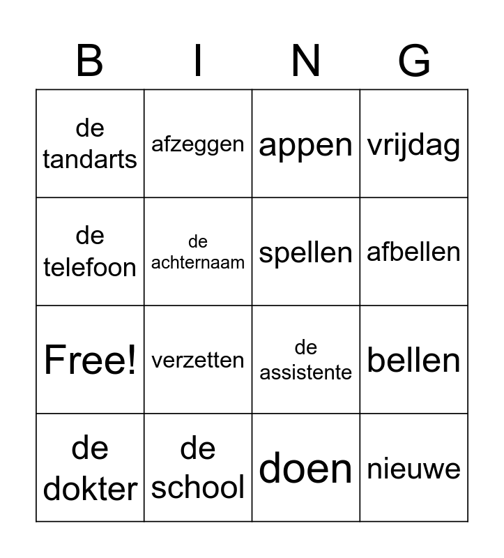 This bingo card has 20 words: bellen, mailen, appen, de afspraak, de dokter, de telefoon, de school, de tandarts, Free!, afzeggen, verzetten, de assistente, de achternaam, nieuwe, spellen, moeilijk, afbellen, vrijdag, doen and rest.