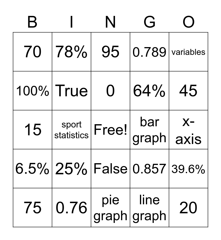 This bingo card has a free space and 24 words: 25%, 0.76, 0, 75, variables, 70, 100%, 78%, bar graph, False, 64%, 15, 0.857, 39.6%, True, line graph, x-axis, 95, 45, sport statistics, 20, 6.5%, 0.789 and pie graph.