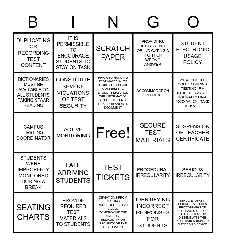 Test Security Bingo | Test Security Bingo | Test Security Bingo | STAAR TRAINING | MCJH Test Security