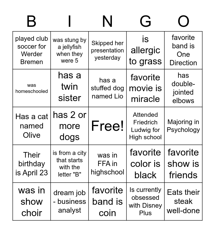 This bingo card has a free space and 24 words: is from a city that starts with the letter "B", dream job - business analyst, has a stuffed dog named Lio, was in show choir, favorite band is One Direction, played club soccer for Werder Bremen, was homeschooled, was stung by a jellyfish when they were 5, Attended Friedrich Ludwig for High school, was in FFA in highschool, favorite movie is miracle, Has a cat named Olive, favorite color is black, favorite show is friends, has a twin sister, Is currently obsessed with Disney Plus, Majoring in Psychology, Skipped her presentation yesterday, has double-jointed elbows, has 2 or more dogs, Eats their steak well-done, Their birthday is April 23, is allergic to grass and favorite band is coin.