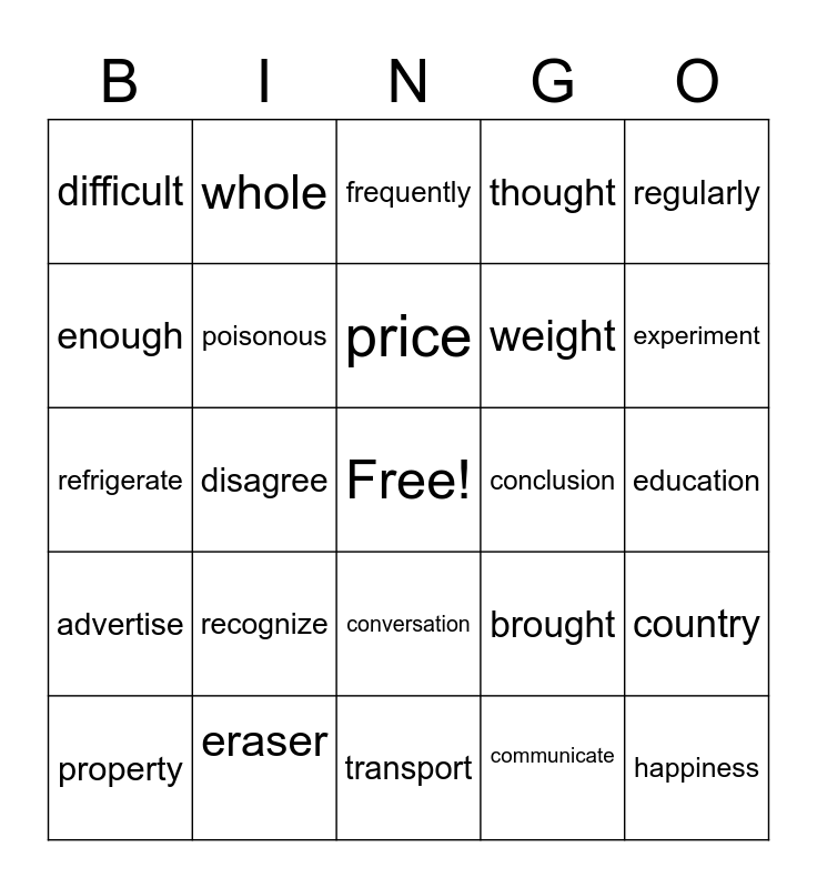 This bingo card has a free space and 29 words: property, relative, disagree, decorate, difficult, frequently, poisonous, recognize, conclusion, eraser, education, happiness, transport, communicate, experiment, success, conversation, advertise, regularly, refrigerate, brought, though, weight, enough, thought, whole, country, price and clown.