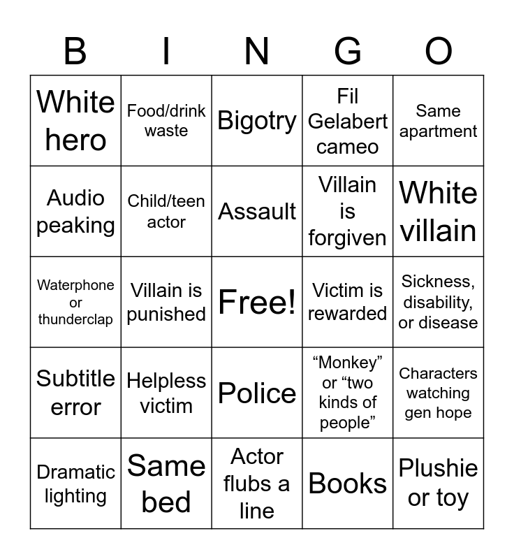 This bingo card has a free space and 24 words: Helpless victim, Same bed, Assault, Dramatic lighting, Same apartment, White hero, Audio peaking, Food/drink waste, Victim is rewarded, Police, Villain is forgiven, Waterphone or thunderclap, “Monkey” or “two kinds of people”, Characters watching gen hope, Child/teen actor, Books, Sickness, disability, or disease, Bigotry, White villain, Villain is punished, Plushie or toy, Subtitle error, Fil Gelabert cameo and Actor flubs a line.