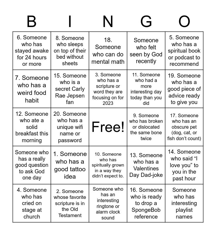 This bingo card has a free space and 24 words: 1. Someone who has a good tattoo idea, 2. Someone whose favorite scripture is in the Old Testament, 3. Someone who has a scripture or word they are focusing on for 2023, 4. Someone who has cried on stage at church, 5. Someone who has a spiritual book or podcast to recommend, 6. Someone who has stayed awake for 24 hours or more, 7. Someone who has a weird food habit, 8. Someone who sleeps on top of their bed without sheets, 9. Someone who has broken or dislocated the same bone twice, 10. Someone who has spiritually grown in a way they didn’t expect to., 11. Someone who had a more interesting day today than you did, 12. Someone who ate a solid breakfast this morning, 13. Someone who has a Valentines Day Dad-joke, 14. Someone who said “I love you” to you in the past hour, 15. Someone who is a secret Carly Rae Jepsen fan, 16. Someone who is ready to drop a SpongeBob reference, 17. Someone who has an obscure pet (dog, cat, or fish don’t count), 18. Someone who can do mental math, 19. Someone who has a good piece of advice ready to give you, 20. Someone who has a unique wifi name or password, Someone who has interesting playlist names, Someone who has a really good question to ask God one day, Someone who felt seen by God recently and Someone who has an interesting ringtone or alarm clock sound.