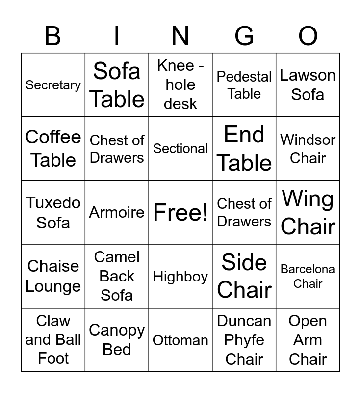 This bingo card has a free space and 30 words: Canopy Bed, Hutch, Armoire, Buffet, Secretary, Knee - hole desk, Chest of Drawers, Highboy, Chest of Drawers, Ottoman, Wing Chair, Open Arm Chair, Duncan Phyfe Chair, Cabriole Leg, Windsor Chair, Trestle Table, Side Chair, Chaise Lounge, Camel Back Sofa, Lawson Sofa, Tuxedo Sofa, Nesting Tables, Sofa Table, End Table, Coffee Table, Pedestal Table, Barcelona Chair, Claw and Ball Foot, Sectional and Credenza.