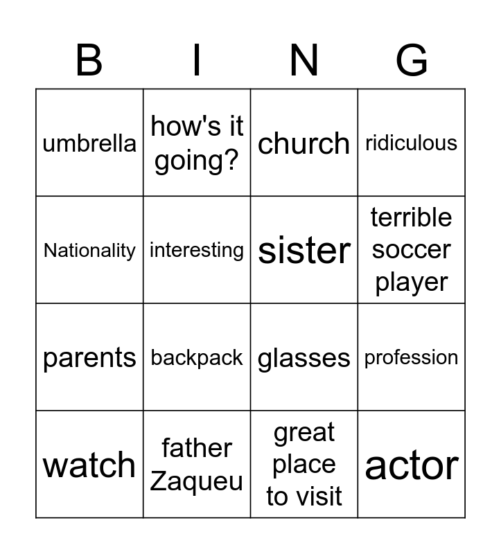 This bingo card has 42 words: Free!, Nationality, email adress, horrible, important, intelligent, interesting, rich, ridiculous, terrible, backpack, glasses, laptop, umbrella, wallet, keys, cousin, parents, brother, sister, profession, seminary, father Zaqueu, church, prayer, what's up?, how's it going?, excuse me, British, Spanish, Chilean, great place to visit, actor, favorite book, excellent movie, hard homework, this is my.., watch, desk, printer, terrible soccer player and delicious food.