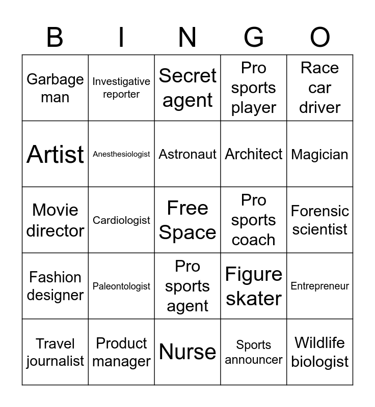 This bingo card has a free space and 45 words: Zoo keeper, Wildlife biologist, Veterinarian, Travel journalist, Teacher, Sports announcer, Secret agent, Rock star, Race car driver, Product manager, Pro sports player, Pro sports coach, Pro sports agent, Paleontologist, Oceanographer, Nurse, Not broke, Movie director, Marine biologist, Magician, Investigative reporter, Hair cutter, Geologist, Garbage man, Game developer, Forensic scientist, Flight attendant, Firefighter, Figure skater, Fashion designer, Environmental attorney, Entrepreneur, Doctor, Concert promoter, Chef, Cardiologist, Biologist, Ballerina, Author, Astronaut, Artist, Architect, Archeologist, Anesthesiologist and Air Force pilot.