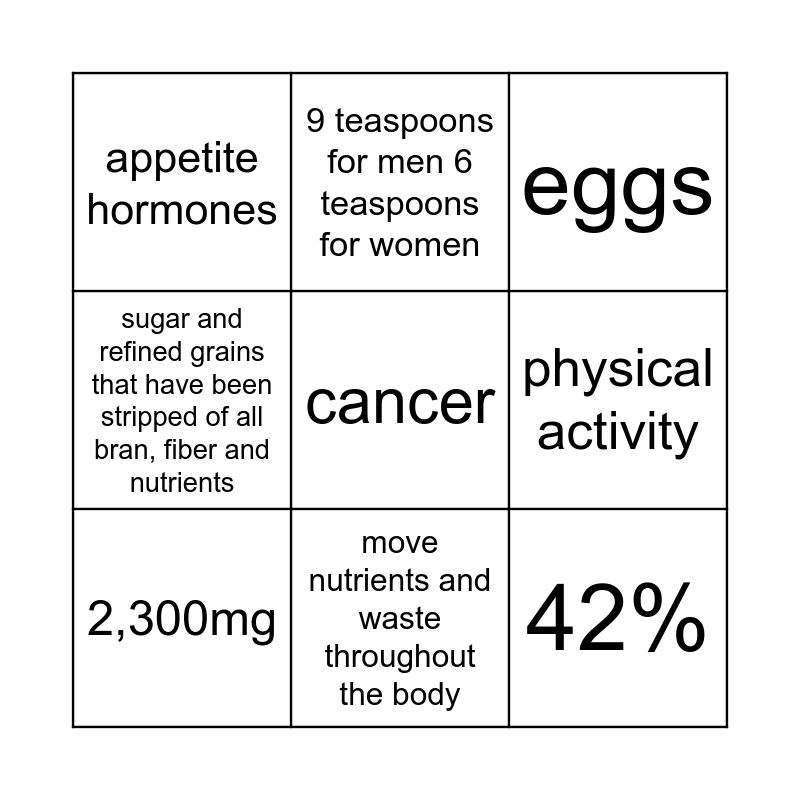 This bingo card has 9 words: 2,300mg, eggs, 9 teaspoons for men 6 teaspoons for women, sugar and refined grains that have been stripped of all bran, fiber and nutrients, appetite hormones, physical activity, cancer, 42% and move nutrients and waste throughout the body.