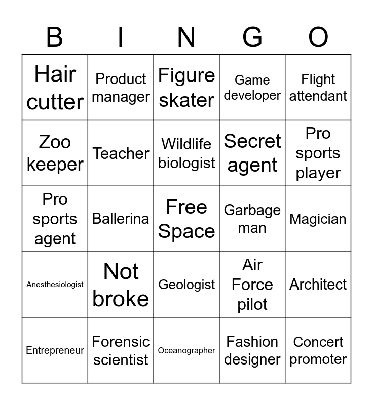 This bingo card has a free space and 45 words: Chef, Concert promoter, Doctor, Entrepreneur, Environmental attorney, Fashion designer, Figure skater, Firefighter, Flight attendant, Forensic scientist, Game developer, Garbage man, Geologist, Not broke, Nurse, Oceanographer, Paleontologist, Pro sports agent, Pro sports coach, Pro sports player, Product manager, Race car driver, Rock star, Hair cutter, Investigative reporter, Magician, Marine biologist, Movie director, Air Force pilot, Anesthesiologist, Archeologist, Architect, Artist, Astronaut, Author, Ballerina, Biologist, Cardiologist, Veterinarian, Wildlife biologist, Zoo keeper, Secret agent, Sports announcer, Teacher and Travel journalist.