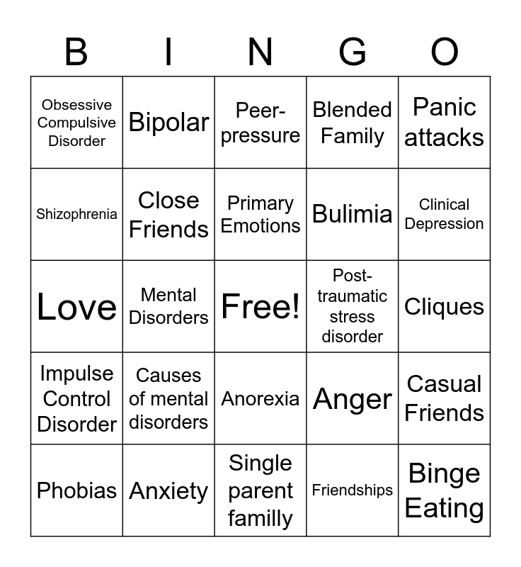 This bingo card has a free space and 24 words: Causes of mental disorders, Anxiety, Primary Emotions, Phobias, Panic attacks, Obsessive Compulsive Disorder, Shizophrenia, Bipolar, Post-traumatic stress disorder, Anorexia, Bulimia, Love, Anger, Casual Friends, Close Friends, Friendships, Cliques, Peer-pressure, Clinical Depression, Mental Disorders, Binge Eating, Impulse Control Disorder, Blended Family and Single parent familly.