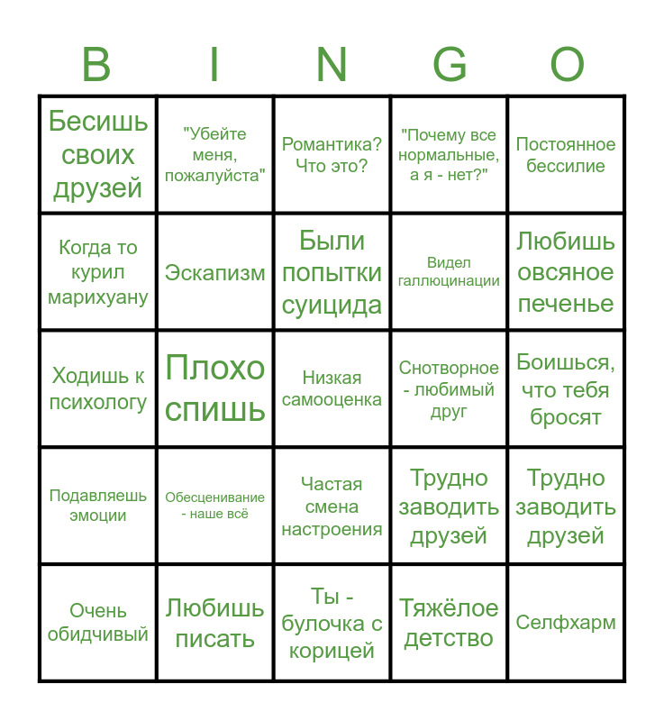 This bingo card has a free space and 24 words: Обесценивание - наше всё, Любишь писать, Были попытки суицида, Очень обидчивый, Постоянное бессилие, Бесишь своих друзей, Когда то курил марихуану, "Убейте меня, пожалуйста", Снотворное - любимый друг, Частая смена настроения, Видел галлюцинации, Ходишь к психологу, Трудно заводить друзей, Трудно заводить друзей, Эскапизм, Тяжёлое детство, Боишься, что тебя бросят, Романтика? Что это?, Любишь овсяное печенье, Плохо спишь, Селфхарм, Подавляешь эмоции, "Почему все нормальные, а я - нет?" and Ты - булочка с корицей.