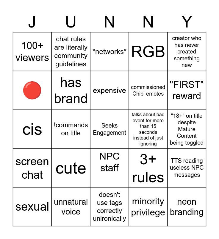 This bingo card has a free space and 24 words: cute, unnatural voice, expensive, sexual, creator who has never created something new, 100+ viewers, 🔴, chat rules are literally community guidelines, talks about bad event for more than 15 seconds instead of just ignoring, NPC staff, commissioned Chibi emotes, cis, 3+ rules, TTS reading useless NPC messages, has brand, minority privilege, "18+" on title despite Mature Content being toggled, *networks*, "FIRST" reward, !commands on title, neon branding, screen chat, RGB and doesn't use tags correctly unironically.