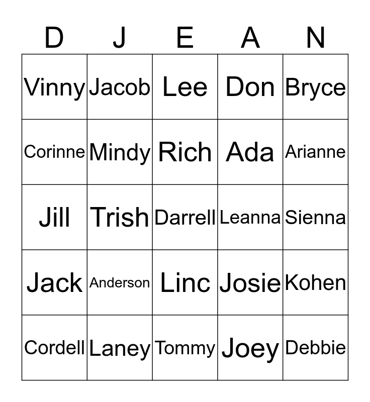 This bingo card has 77 words: Connie, Jenna, Lee, Angie, Alex L., Jeff, Brian, Steve, Ashley, Amber, Debbie, Hal, Rich, Corinne, Emily, Trish, Lynda, Darrell, Jereme, Bryce, Holly, Jill, Mindy, Jacob, Don, Shane, Brindy, Alex B., Asa, Heidi, Hayley, Adam, Jordan, Josie, Arianne, Ada, Josh D., Andrew, Sienna, Joey, Josh B., Kaycee, Matt, Rock, Riley, Alexis, Cordell, Vinny, Zander, Freddie, Belle, Linc, Lucy, Gigi, Betty, Zoey, Henry, Gus, Oliver, Eli, Anderson, Aspen, Ace, Aussie, Axl, Audi, Nora, Leanna, Matias, Kadin, Ivy, Kohen, Jack, Laney, Renny, Tommy and Baby Hawkes.