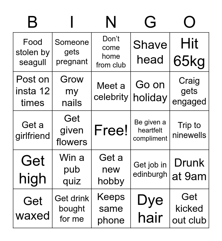 This bingo card has a free space and 24 words: Win a pub quiz, Get drink bought for me, Meet a celebrity, Get waxed, Hit 65kg, Food stolen by seagull, Post on insta 12 times, Someone gets pregnant, Be given a heartfelt compliment, Get a new hobby, Go on holiday, Get a girlfriend, Get job in edinburgh, Drunk at 9am, Grow my nails, Dye hair, Trip to ninewells, Don’t come home from club, Craig gets engaged, Get given flowers, Get kicked out club, Get high, Shave head and Keeps same phone.