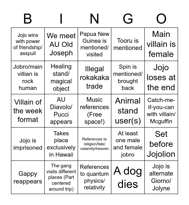 This bingo card has a free space and 24 words: Takes place exclusively in Hawaii, The gang visits different places (Part centered around trip), Illegal rokakaka trade, Gappy reappears, Main villain is female, Jojo wins with power of friendship/ asspull, Jobro/main villian is rock human, We meet AU Old Joseph, Animal stand user(s), References to religion/fate/ calamity/heaven, Spin is mentioned/ brought back, Villain of the week format, At least one male and female jobro, Set before Jojolion, Healing stand/ magical object, A dog dies, Catch-me-if-you-can with villain/ Mcguffin, Papua New Guinea is mentioned/ visited, Jojo loses at the end, AU Diavolo/ Pucci appears, Jojo is alternate Giorno/ Jolyne, Jojo is imprisoned, Tooru is mentioned and References to quantum physics/ relativity.