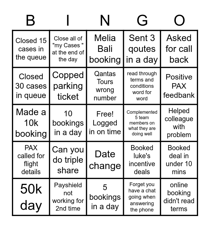 This bingo card has a free space and 34 words: Got called the wrong name, Forget you have a chat going when answering the phone, Busy under an hour, "Invalid PIN" QFF, PAX called for flight details, Copped parking ticket, Asked for call back, 50k day, Close all of "my Cases " at the end of the day, First call complaint resolution, Qantas Tours wrong number, Melia Bali booking, Got referred to as 'You People ", Didn't want to fly Malaysian air, Complemented 5 team members on what they are doing well, Positive PAX feedbank, Payshield not working for 2nd time, Made a 10k booking, Can you do triple share, Booked luke's incentive deals, Date change, Made 5k booking, Closed 15 cases in the queue, Helped colleague with problem, 5 bookings in a day, online booking didn't read terms, Sent 3 qoutes in a day, 5 Change calls in a row, read through terms and conditions word for word, Closed 30 cases in queue, No missed calls, 10 bookings in a day, Booked deal in under 10 mins and 5 TP enquires in a day.