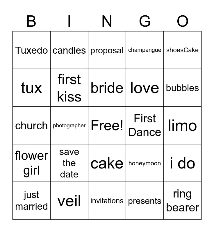This bingo card has a free space and 35 words: bride, groomsmen, first dance, first kiss, cake, champangue, tux, wedding dress, bride, groom, church, shoesCake, Bouquet, Champagne, Tuxedo, First Dance, presents, photographer, flower girl, ring bearer, honeymoon, just married, i do, veil, proposal, bubbles, reception, dinner, love, limo, DJ, invitations, save the date, candles and honeymoon.