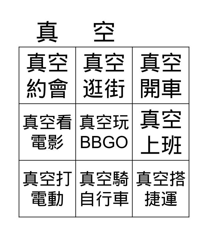 This bingo card has a free space and 8 words: 真空上班, 真空開車, 真空逛街, 真空打電動, 真空約會, 真空搭捷運, 真空看電影 and 真空騎自行車.
