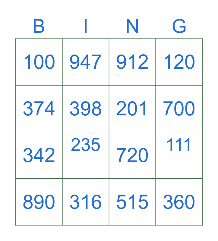 This bingo card has 36 words: 125, 243, 300, 201, 566, 360, 700, 817, 374, 999, 111, 120, 230, 316, 235, 100, 670, 780, 890, 912, 515, 693, 435, 341, 235, 947, 720, 473, 342, 398, 395, 939, 233, 925, 105 and 126.
