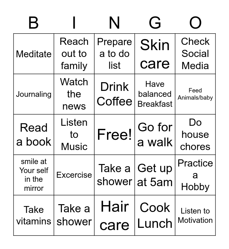 This bingo card has a free space and 24 words: Excercise, Take a shower, Drink Coffee, Take vitamins, Check Social Media, Meditate, Journaling, Reach out to family, Go for a walk, Take a shower, Have balanced Breakfast, Read a book, Get up at 5am, Practice a Hobby, Watch the news, Cook Lunch, Do house chores, Prepare a to do list, Feed Animals/baby, Listen to Music, Listen to Motivation, smile at Your self in the mirror, Skin care and Hair care.