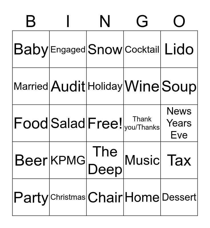 This bingo card has a free space and 24 words: KPMG, Christmas, Holiday, Party, Lido, Baby, Married, Engaged, Thank you/Thanks, The Deep, Wine, Food, Music, Tax, Audit, Home, News Years Eve, Snow, Soup, Salad, Dessert, Beer, Cocktail and Chair.