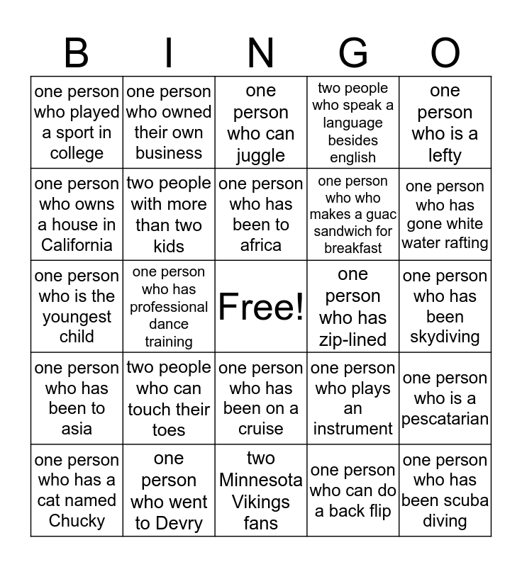 This bingo card has a free space and 36 words: one person not born in the united states, one person who has lived outside North America, two people who have attended school outside the US, two people with more than two kids, one person who plays an instrument, one person who has been to asia, one person who has been to africa, one person who has been to south america, one person who is a lefty, one person who doesn’t drink coffee, one person who has professional dance training, two people who speak a language besides english, one person who is a middle child, one person who has zip-lined, one person who has gone white water rafting, one person who played a sport in college, one person who was in a fraternity/sorority, two people who can touch their toes, one person who has been scuba diving, one person who can juggle, one person who has been skydiving, one person who is a pescatarian, one person who went to Devry, one person who has a cat named Chucky, two Minnesota Vikings fans, one person who owned their own business, one person who is the youngest child, two people who have lived in more than 3 states, one person who who makes a guac sandwich for breakfast, one person who owns a house in California, two people who have lived in Maryland, two people who have worked at IC for more than 5 years, one person who can do a back flip, one person who has been on a cruise, one person who has never been to Las Vegas and one person who has seen Michael Jackson in concert.