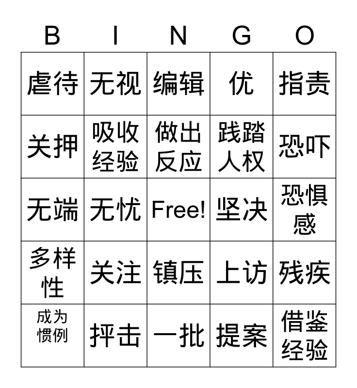 This bingo card has a free space and 24 words: 关注, 抨击, 做出反应, 成为 惯例, 指责, 虐待, 关押, 无视, 坚决, 镇压, 践踏人权, 无端, 上访, 残疾, 吸收经验, 提案, 恐惧感, 编辑, 恐吓, 无忧, 借鉴经验, 多样性, 优 and 一批.