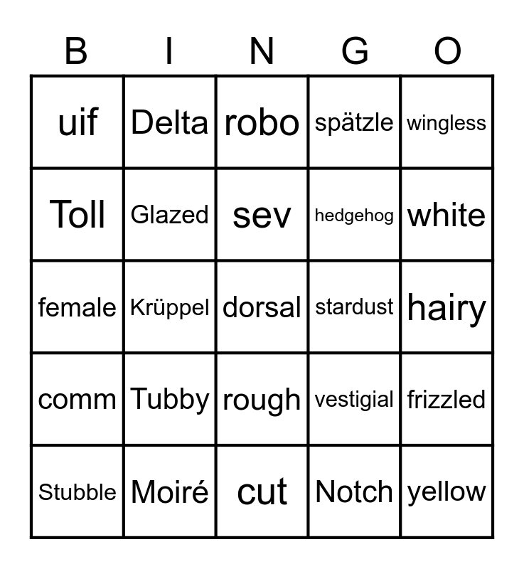 This bingo card has 38 words: Free!, Ubx, Humeral, Glazed, frizzled, Tubby, sev, torpedo, wingless, hedgehog, Krüppel, spätzle, dorsal, hairy, Toll, comm, slit, robo, inflated, stardust, uif, Moiré, white, Stubble, Cy, cut, yellow, ebony, eya, Bar, ruby, rough, Notch, Delta, Serrate, vestigial, female and male.