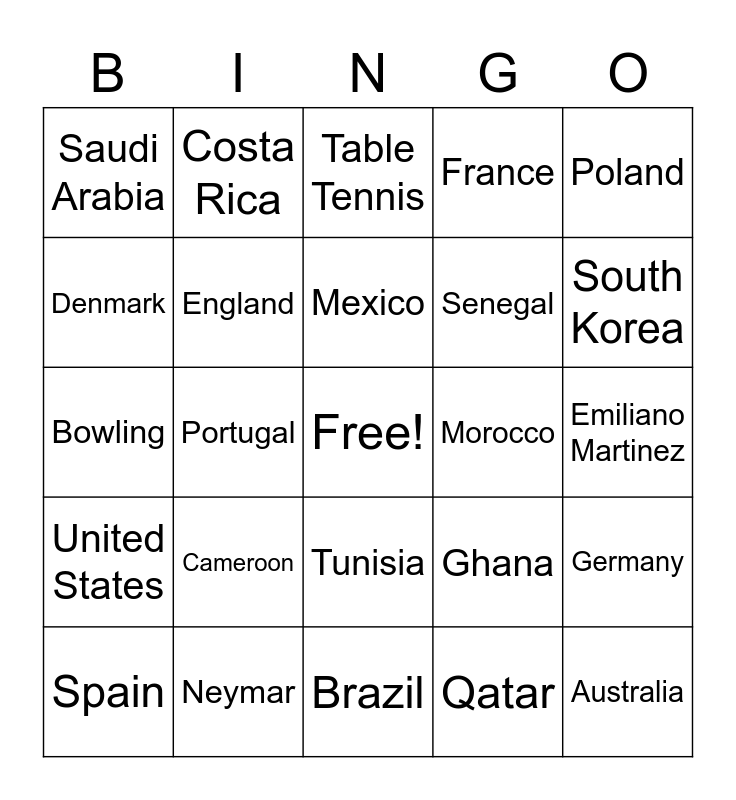 This bingo card has a free space and 46 words: Argentina, Australia, Belgium, Brazil, Cameroon, Canada, Costa Rica, Croatia, Denmark, Ecuador, England, France, Germany, Ghana, Iran, Japan, Mexico, Morocco, Netherlands, Poland, Portugal, Qatar, Saudi Arabia, Senegal, Serbia, South Korea, Spain, Switzerland, Tunisia, United States, Uruguay, Wales, Cristiano Ronaldo, Kylian Mbappe, Lionel Messi, Neymar, Emiliano Martinez, Basketball, Boxing, Tennis, Golf, Table Tennis, Bowling, BMX, Archery and Badminton.