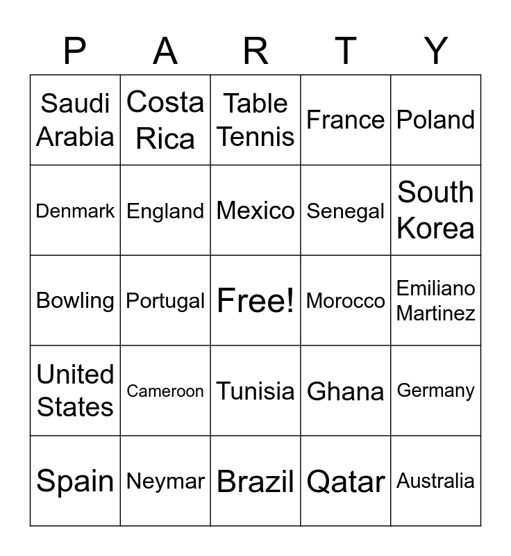 This bingo card has a free space and 46 words: Argentina, Australia, Belgium, Brazil, Cameroon, Canada, Costa Rica, Croatia, Denmark, Ecuador, England, France, Germany, Ghana, Iran, Japan, Mexico, Morocco, Netherlands, Poland, Portugal, Qatar, Saudi Arabia, Senegal, Serbia, South Korea, Spain, Switzerland, Tunisia, United States, Uruguay, Wales, Cristiano Ronaldo, Kylian Mbappe, Lionel Messi, Neymar, Emiliano Martinez, Basketball, Boxing, Tennis, Golf, Table Tennis, Bowling, BMX, Archery and Badminton.
