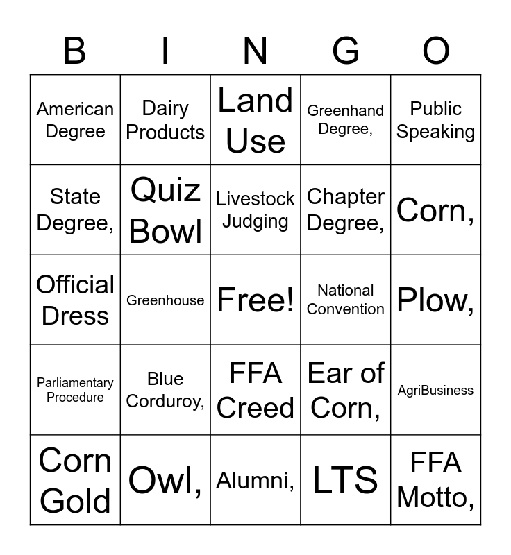 This bingo card has a free space and 32 words: LTS, Fruit Sales, Greenhouse, Meetings, Parliamentary Procedure, Quiz Bowl, Public Speaking, AgriBusiness, Dairy Products, Ag Mechanics, Livestock Judging, Land Use, Agronomy, State Convention, National Convention, National Blue, Corn Gold, Official Dress, FFA Creed, Blue Corduroy,, Ear of Corn,, Rising sun, Plow,, Owl,, FFA Motto,, Greenhand Degree,, Chapter Degree,, State Degree,, American Degree, Alumni,, New Horizons, and Corn,.