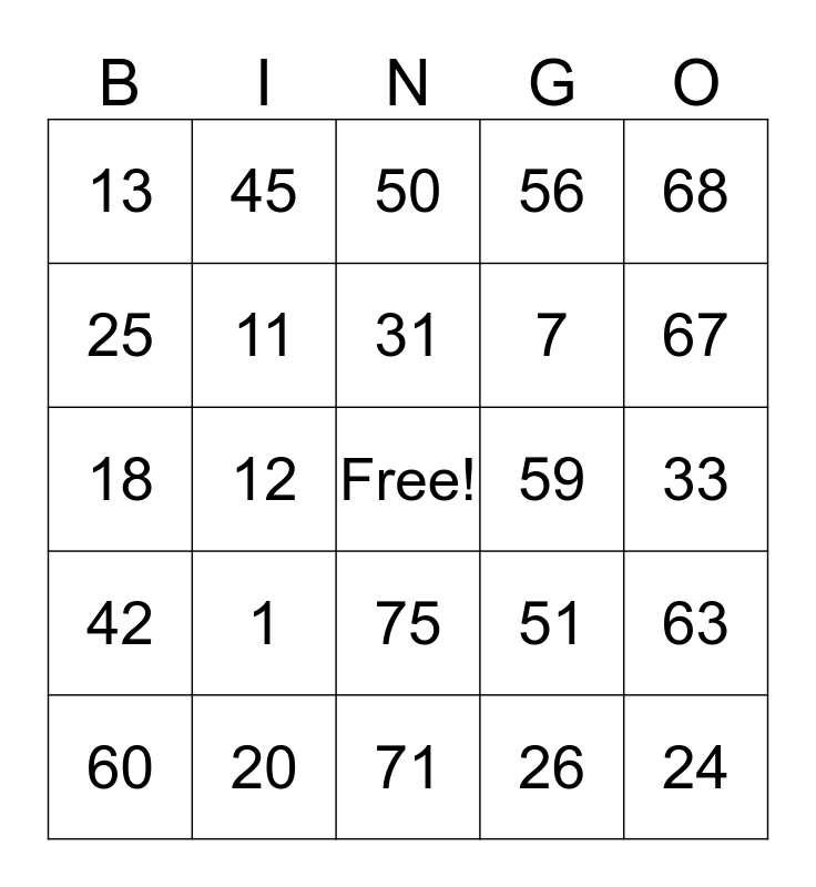 This bingo card has a free space and 24 words: 1, 20, 31, 60, 68, 13, 25, 45, 59, 75, 7, 18, 51, 63, 11, 26, 33, 50, 67, 12, 24, 42, 56 and 71.