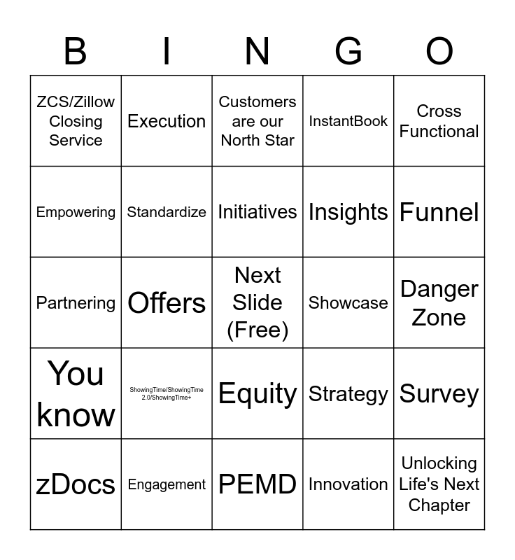 This bingo card has a free space and 75 words: Own It, Turn on The Lights, Customers are our North Star, Do the Right Thing, Better Together, Include and Empower, Think Big, Move Fast, Deliver Quality on Time, Every Time, Beth/Sebastian/Shelby - Buyer/Seller personas, Alan, Irene/Harriet - Investor/Homeowner personas, Tour, Initiatives, Empowering, Exciting, Offers, Bridge, Unlocking Life's Next Chapter, Really Good Place, Cross Functional, Best In-class, Partnering, Standardize, Execution, InstantBook, Super App, ZHL, Mortgages, Bruh, Reorg, Customer Solutions, Find the One, Test Kitchen, Strategy, Funnel, Insights, Voice of the Customer, Integrated Buying Experience, Danger Zone, Innovation, Rachel/Ruben/Rick - Renter Personas, LOB/Line of Business, Subgraph/GraphQL, ZConnect, PA/Premier Agent, DotLoop, zDocs, ZCS/Zillow Closing Service, 4 Day Work Week, Inflation, Compensation, Equity, zRes/Zillow Real Estate Software, One Zillow, RMX, Go to Market, Zillow 2.0, Rowing/Row the boat/In the boat, AI/ML, StreetEasy, ShowingTime/ShowingTime 2.0/ShowingTime+, OpenDoor, Build Together Summit, Connections, Spotlight, Showcase, Competitive, ZallWay, VRX, Survey, You know, Engagement, Acorns, PEMD and Cloud HQ.