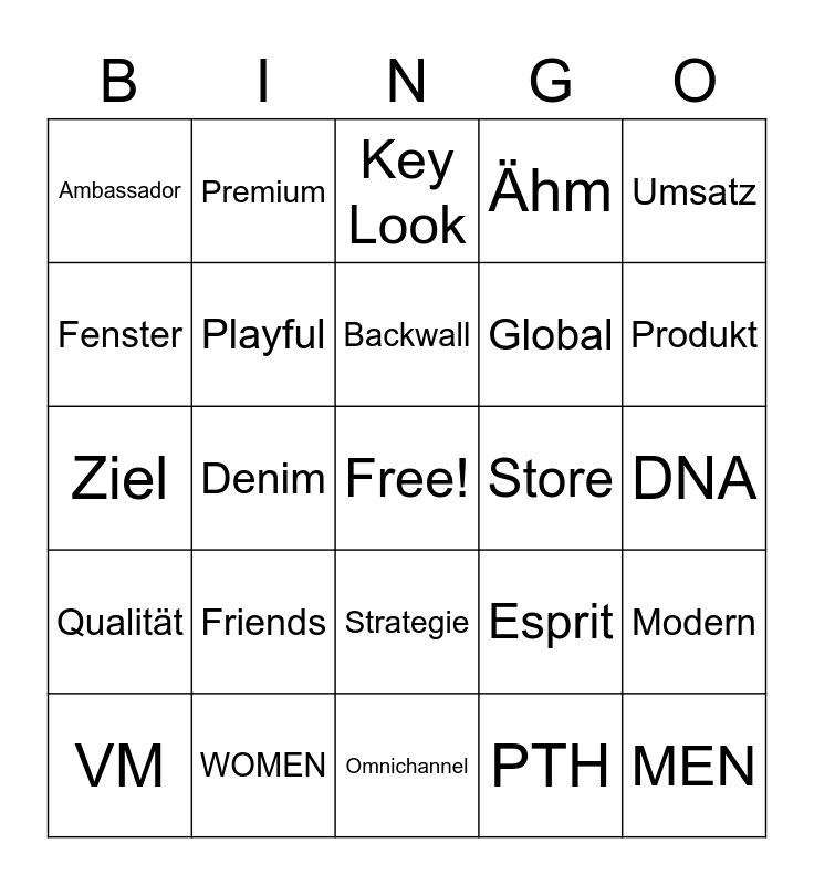 This bingo card has a free space and 25 words: Friends, Omnichannel, Backwall, VM, Umsatz, Ambassador, Fenster, Premium, Store, Strategie, Global, Ziel, Esprit, Modern, Playful, Cool, DNA, Key Look, Produkt, Denim, MEN, WOMEN, Qualität, Ähm and PTH.