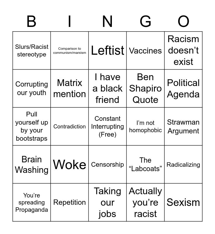 This bingo card has a free space and 24 words: You’re spreading Propaganda, Woke, I have a black friend, Actually you’re racist, Racism doesn’t exist, Slurs/Racist stereotype, Comparison to communism/marxism, Leftist, I’m not homophobic, Strawman Argument, Pull yourself up by your bootstraps, Matrix mention, The “Labcoats”, Radicalizing, Corrupting our youth, Repetition, Taking our jobs, Vaccines, Political Agenda, Brain Washing, Contradiction, Censorship, Ben Shapiro Quote and Sexism.