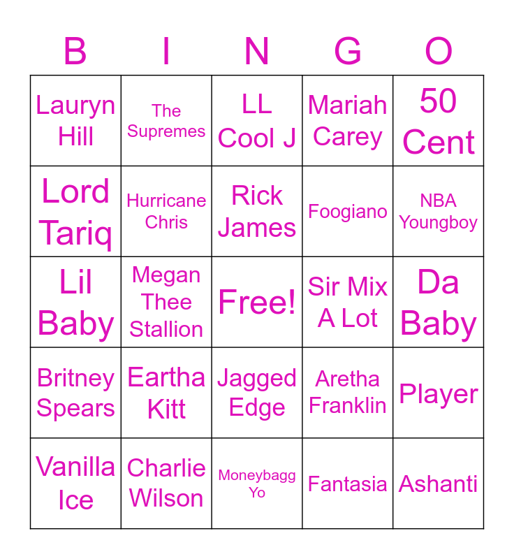 This bingo card has a free space and 40 words: Justin Bieber, Lil Baby, R. Kelly, Hurricane Chris, Charlie Wilson, Jagged Edge, Rick James, Tupac, 50 Cent, Britney Spears, Megan Thee Stallion, Mariah Carey, Ashanti, Da Baby, Sir Mix A Lot, Eartha Kitt, Michael Jackson, Lauryn Hill, Brandy, LL Cool J, Player, Fantasia, Foogiano, Lord Tariq, Usher, Whitney Houston, TLC, Lil Romeo, Pop Smoke, Young Dolph, Beyoncé, Vanilla Ice, Marvin Gaye, Aretha Franklin, NBA Youngboy, Moneybagg Yo, Pinkfong, Plies, The Supremes and 3LW.