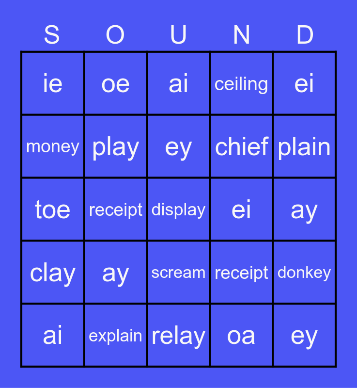 This bingo card has a free space and 24 words: ai, ay, ey, oa, ei, ie, oe, ai, ei, ay, toe, play, receipt, donkey, money, explain, relay, ceiling, plain, clay, receipt, scream, chief and ey.