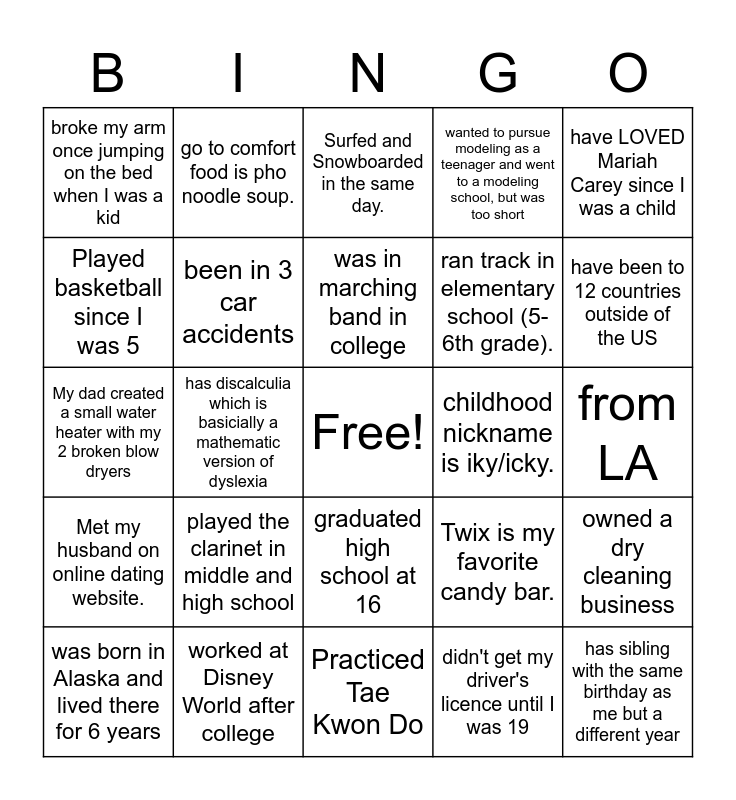 This bingo card has a free space and 27 words: Twix is my favorite candy bar., competed in a spelling bee when I was younger (did not win), ran track in elementary school (5-6th grade)., Practiced Tae Kwon Do, Played basketball since I was 5, Surfed and Snowboarded in the same day., go to comfort food is pho noodle soup., Met my husband on online dating website., childhood nickname is iky/icky., owned a dry cleaning business, My dad created a small water heater with my 2 broken blow dryers, wanted to pursue modeling as a teenager and went to a modeling school, but was too short, was born in Alaska and lived there for 6 years, worked at Disney World after college, have been to 12 countries outside of the US, broke both of my ankles at the same time on Mother’s day, been in 3 car accidents, was in marching band in college, played the clarinet in middle and high school, broke my arm once jumping on the bed when I was a kid, from LA, didn't get my driver's licence until I was 19, has discalculia which is basicially a mathematic version of dyslexia, has sibling with the same birthday as me but a different year, graduated high school at 16, have LOVED Mariah Carey since I was a child and grew up singing in the church choir.