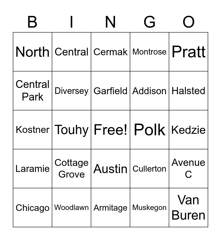 This bingo card has a free space and 57 words: Kinzie, Chicago, Division, North, Armitage, Fullerton, Diversey, Belmont, Addison, Irving Park, Montrose, Lawrence, Foster, Bryn Mawr, Peterson, Devon, Pratt, Touhy, Howard, Van Buren, Polk, Roosevelt, Cullerton, Cermak, Pershing, Garfield, Marquette, Stewart, Halsted, Racine, Ashland, Damen, Western, California, Kedzie, Central Park, Pulaski, Kostner, Cicero, Laramie, Central, Austin, Narragansett, Oak Park, Harlem, King, Cottage Grove, Woodlawn, Stony Island, Jeffery, Yates, Muskegon, Commercial, BRandon, Avenue L, Avenue C and State Line Road.