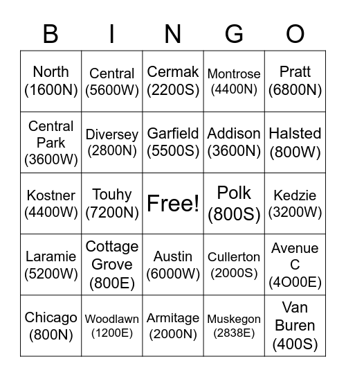 This bingo card has a free space and 57 words: Kinzie (400N), Chicago (800N), Division (1200N), North (1600N), Armitage (2000N), Fullerton (2400N), Diversey (2800N), Belmont (3200N), Addison (3600N), Irving Park (4000N), Montrose (4400N), Lawrence (4800N), Foster (5200N), Bryn Mawr (5600N), Peterson (6000N), Devon (6400N), Pratt (6800N), Touhy (7200N), Howard (7600N), Van Buren (400S), Polk (800S), Roosevelt (1200S), Cullerton (2000S), Cermak (2200S), Pershing (3900S), Garfield (5500S), Marquette (6700S), Stewart (400W), Halsted (800W), Racine (1200W), Ashland (1600W), Damen (2000W), Western (2400W), California (2800W), Kedzie (3200W), Central Park (3600W), Pulaski (4000W), Kostner (4400W), Cicero (4800W), Laramie (5200W), Central (5600W), Austin (6000W), Narragansett (6400W), Oak Park (6800W), Harlem (72000W), King (400E), Cottage Grove (800E), Woodlawn (1200E), Stony Island (16000E), Jeffery (2000E), Yates (2400E), Muskegon (2838E), Commercial (3000E), Brandon (32000E), Avenue L (36000E), Avenue C (4O00E) and State Line Road (4100E).
