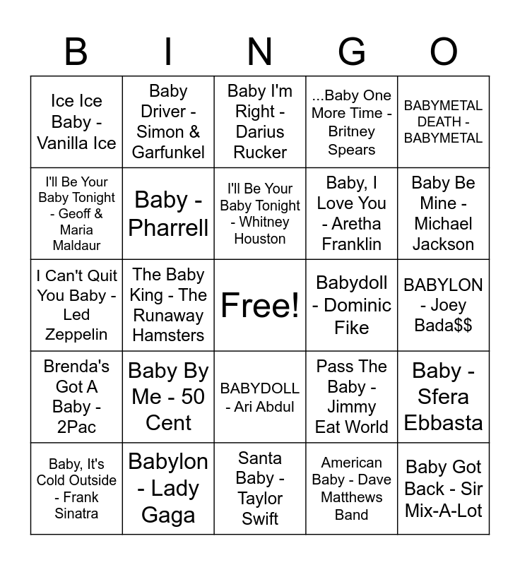 This bingo card has a free space and 45 words: Baby - Justin Bieber, Baby Got Back - Sir Mix-A-Lot, Industry Baby - Jack Harlow, Baby, It's Cold Outside - Frank Sinatra, Baby, Please Don't Go - AC/DC, American Baby - Dave Matthews Band, Baby I'm Right - Darius Rucker, Rock Wit U (Awwww Baby) - Ashanti, BABYMETAL DEATH - BABYMETAL, Babylon - Lady Gaga, ...Baby One More Time - Britney Spears, Babydoll - Dominic Fike, BABYDOLL - Ari Abdul, Baby By Me - 50 Cent, Baby Boy - Beyonce, Santa Baby - Taylor Swift, Baby - Brandy, I Can't Quit You Baby - Led Zeppelin, Give It To Me Baby - Rick James, Baby Be Mine - Michael Jackson, Baby Driver - Simon & Garfunkel, Baby, Let's Play House - Elvis Presley, Nobody Puts Baby In The Corner - Fall Out Boy, Ice Ice Baby - Vanilla Ice, Baby - Quality Control, BABYLON - Joey Bada$$, Brown Eyes Baby - Keith Urban, Baby Boy - Childish Gambino, Pass The Baby - Jimmy Eat World, Brenda's Got A Baby - 2Pac, Too Busy Thinking About My Baby - Marvin Gaye, Baby - Sfera Ebbasta, Baby I'm Yours - Arctic Monkeys, Baby, I'm Back - Baby Bash, Don't Worry Baby - The Beach Boys, The Baby King - The Runaway Hamsters, Baby It's You - JoJo, I'll Be Your Baby Tonight - Norah Jones, I'll Be Your Baby Tonight - Bob Dylan, I'll Be Your Baby Tonight - Whitney Houston, I'll Be Your Baby Tonight - Geoff & Maria Maldaur, Baby, I Love You - Aretha Franklin, Baby, I Love You - Ramones, Baby - Pharrell and Tell Me, Tell Me...Baby - *NSYNC.